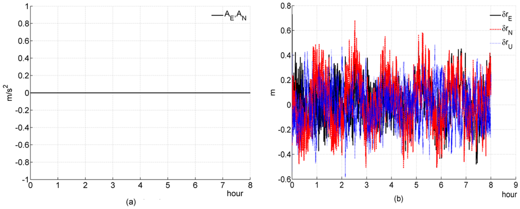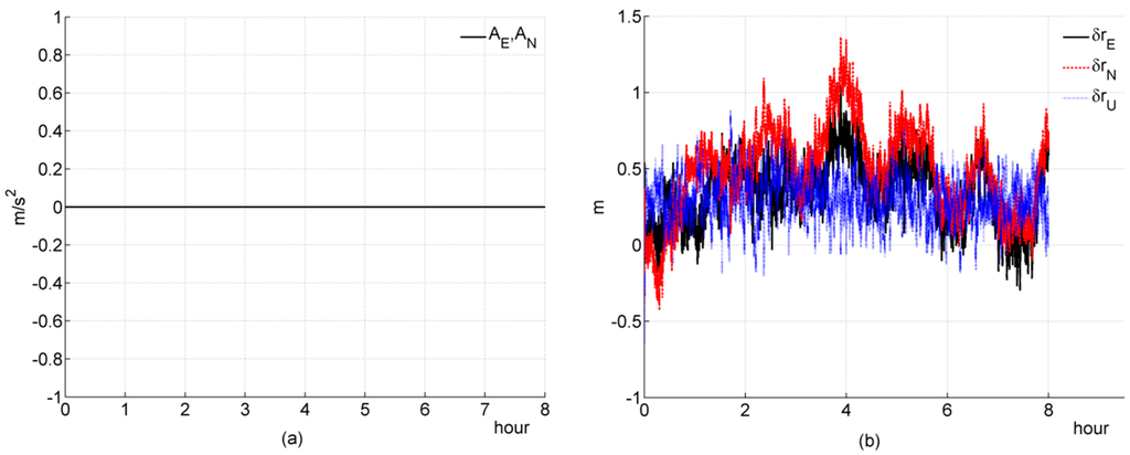 Equation (4b) possesses the same measurement matrix form as the measurement matrix of a loosely coupled system. Through Equation (4), we can draw a conclusion that a loosely coupled SINS/GPS is equivalent to a tightly coupled SINS/GPS essentially when the number of visible satellites is four or more. can be calculated accurately after each measurement; in other word, can be observed directly all the time. The analogous idea can be found in references [1,2,9,19]. Then, the filter can estimate the other elements of the system state based on the estimated values of and . If the measurement data provided by a GPS receiver are not precise, and cannot be estimated precisely, and then the other elements will be contaminated.