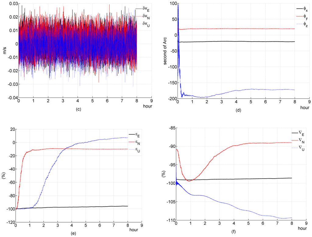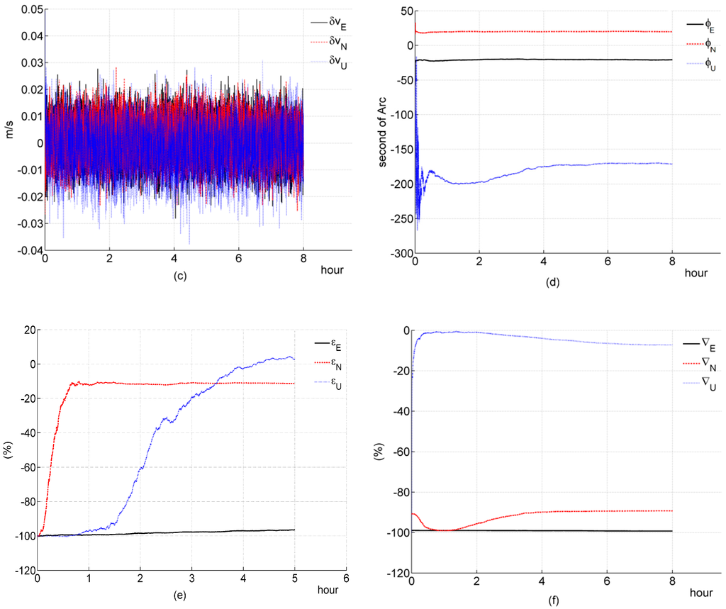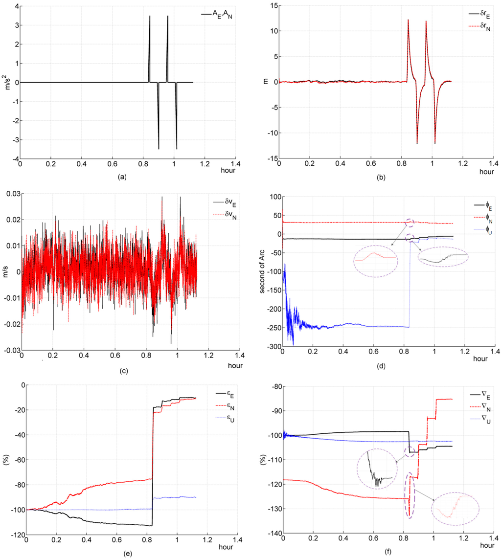 Simulation results of a two-channel system during a stationary condition. (a) acceleration; (b) deviation of estimated position error elements; (c) deviation of estimated velocity error elements; (d) deviation of estimated platform error angle; (e) percentage of deviation of estimated gyroscope bias; (f) percentage of deviation of estimated accelerometer bias.