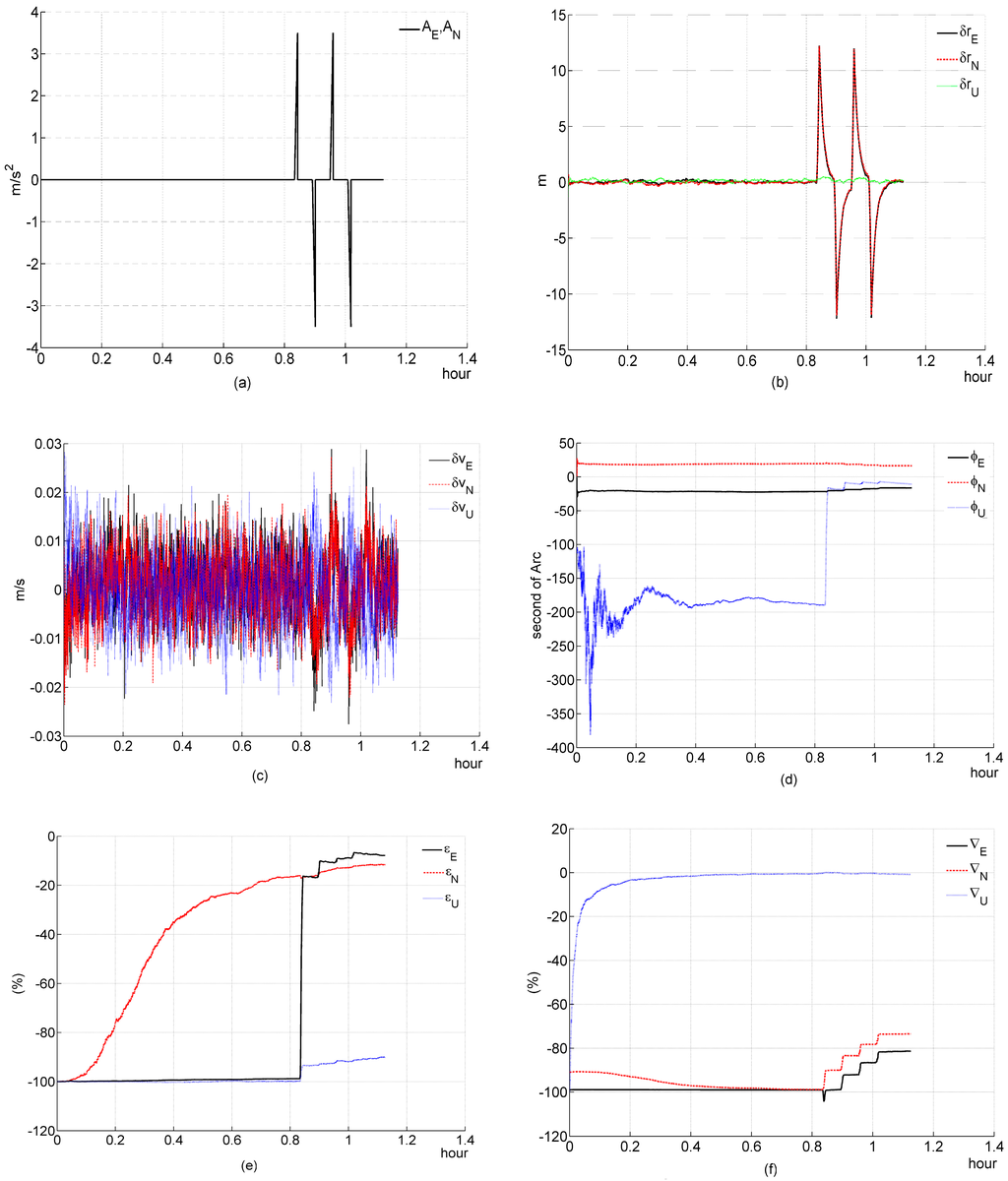 Simulation results of the three-channel system during a slop acceleration maneuver. (a) acceleration; (b) deviation of estimated position error elements; (c) deviation of estimated velocity error elements; (d) deviation of estimated platform error angle; (e) percentage of deviation of estimated gyroscope bias; (f) percentage of deviation of estimated accelerometer bias.