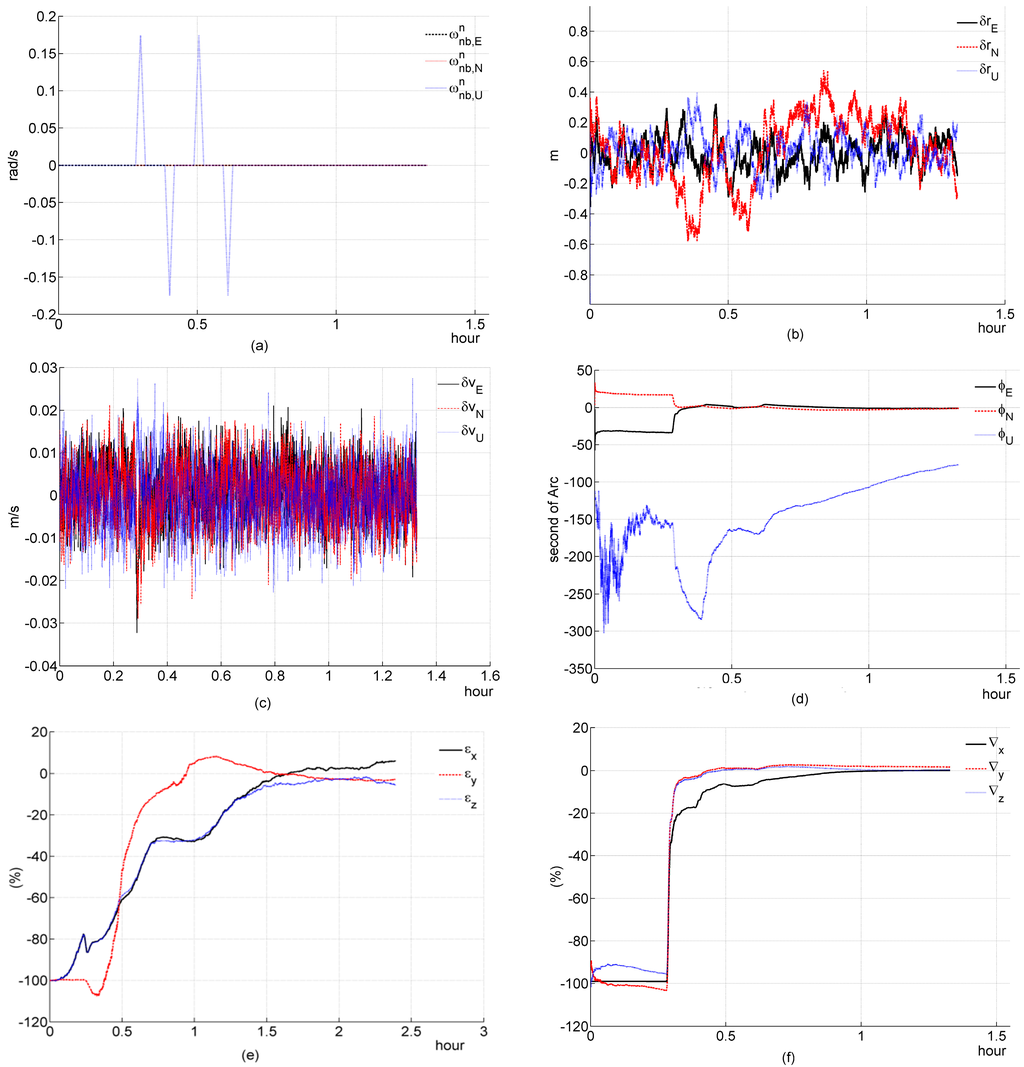 Simulation results of two-channel system during a triangle angle velocity maneuver. (a) angular velocity of b-frame relative to n-frame; (b) deviation of estimated position error elements; (c) deviation of estimated velocity error elements; (d) deviation of estimated platform error angle; (e) percentage of deviation of estimated gyroscope bias; (f) percentage of deviation of estimated accelerometer bias.