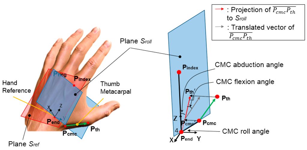 The kinematic definition of the CMC-joint proposed in this study is shown in Figure 2. Here, two planes and a vector corresponding to the thumb metacarpal bone were defined using five reference points (Pring: dorsal aspect of the ring finger metacarpophangeal (MCP) joint; Pindex: dorsal aspect of the index finger MCP joint; Pend: end point of the second metacarpal bone that meets with the carpal bones; Pcmc: dorsal aspect of the CMC-joint; Pth: dorsal aspect of the thumb MCP joint). The hand reference plane, Sref, is defined by Pring, Pindex, and Pend, while the second reference plane, Sroll, is defined by Pindex, Pend, and Pcmc. The vector corresponding to the thumb metacarpal bone was defined as . The angle between Sref and Sroll defines the CMC roll angle. The CMC flexion angle can then be defined as the angle between and Sroll. Finally, the CMC abduction angle was defined as the angle between two vectors on plane Sroll—, the projected vector of on plane Sroll and . The proposed method to define three DOFs of the CMC-joint is different from previous biomechanical models [8] and/or kinematic models used in sensing devices [11,16], since the proposed model first computes the CMC roll angle as a basis to define the CMC-joint flexion/extension and adduction/abduction angles. The proposed definition not only allows external derivation of the CMC-joint flexion and abduction angles from the hand surface, but is also consistent with the clinical definition of the CMC-joint angles (i.e., that the flexion/extension (abduction/adduction) axes of all thumb joints are parallel) [6].