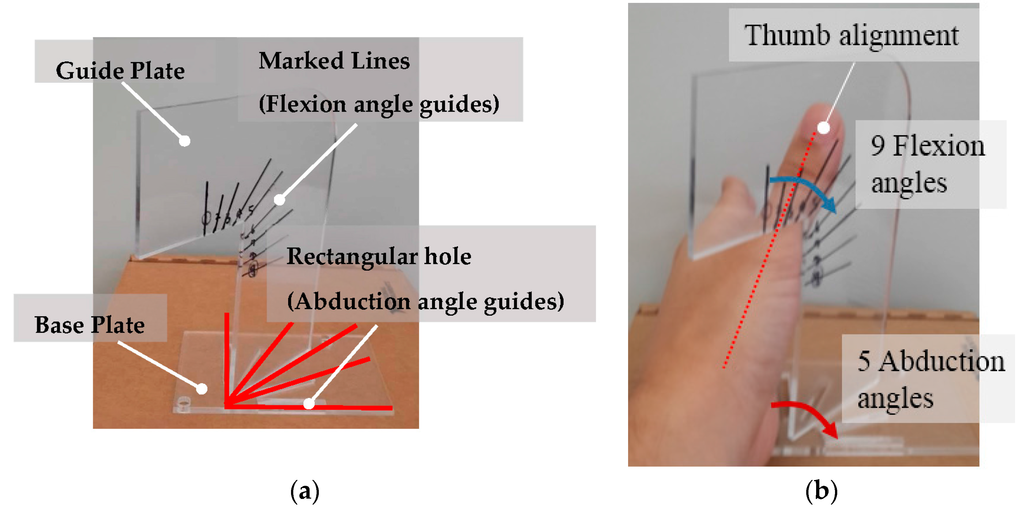 Thumb posture guide: (a) thumb posture guide overview; (b) thumb posing on the guide.