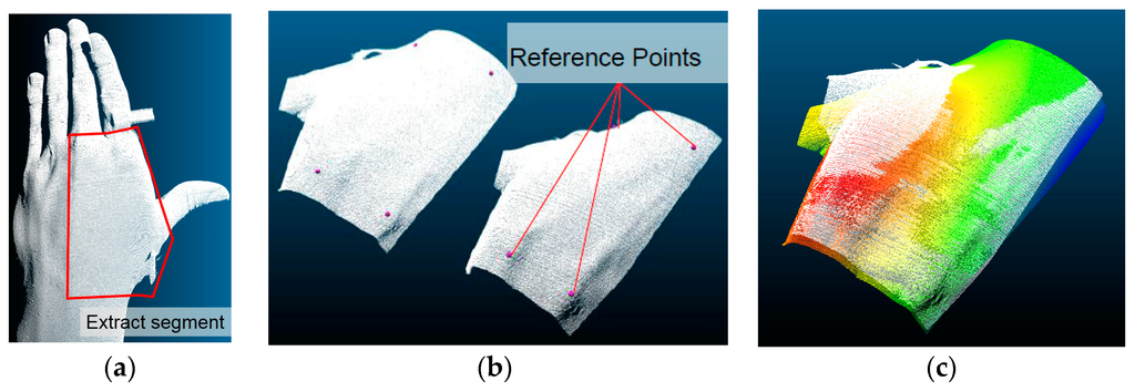 As we focused on the deformation of the hand surface by the CMC-joint movements, only the hand surface area containing the first, second, and third metacarpal bones was considered (Figure 4a). Other areas of the hand were cropped from the point-cloud data using the CloudCompare open source software (CloudCompare, (version 2.6.1) (GPL software) (2015)) [20] segmentation function. A representative image of the 3D point cloud after the cropping process is shown in Figure 4b.