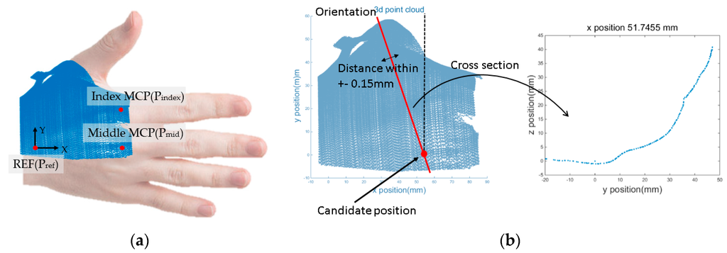 After the transformation, the curve along the hand surface was derived for 44 candidate positions (11 x-coordinates and 4 y-coordinates; each coordinate having the same interval) and 36 orientations. The candidate orientations were set at −90° to 90° in five-degree increments. For a single candidate location, an intersection plane, Sint, was defined that intersects with the candidate position, is directed along the candidate orientation, and is placed normal to the x–y plane. The 3D hand-surface data points intersecting with Sint were defined as the points that were within 0.15 mm from Sint. An illustration of deriving the curve along the hand surface is shown in Figure 5b.