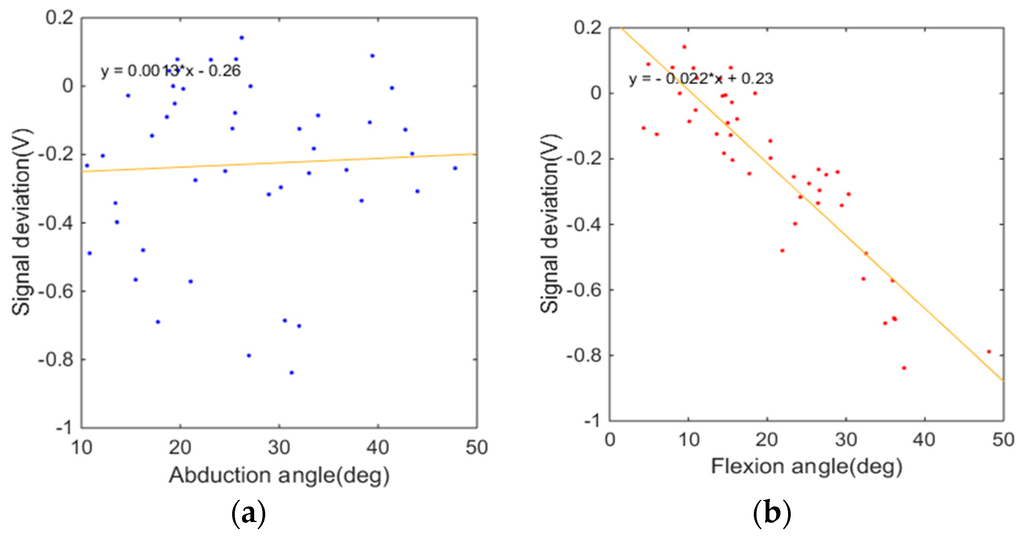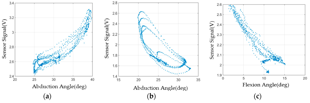 Representative results of the sensor output with respect to the targeted CMC-joint angle (abduction and flexion angle) are shown in Figure 10.
