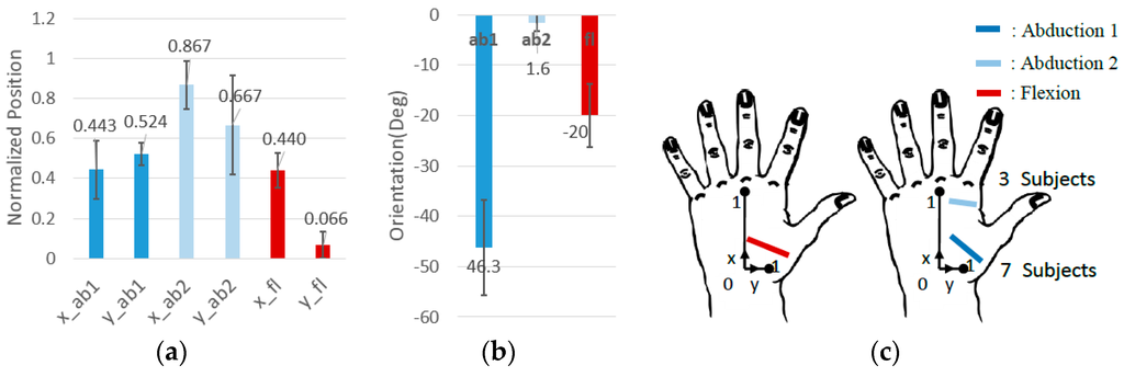 Average optimal CMC sensor position and orientations (10 subjects): (a) average optimal CMC-joint angle sensor positions; (b) average optimal CMC-joint angle sensor orientations; (c) illustration of the optimal CMC-joint angle sensor location. The abduction sensor had two distinct location trends. The optimal sensor location of seven subjects was across the adductor pollicis (mean: x = 0.442, y = 0.524, orientation = −46.3°), and the optimal sensor location for three subjects was across the 2nd metacarpal bone (mean: x = 0.867, y = 0.667, orientation = −1.7°).