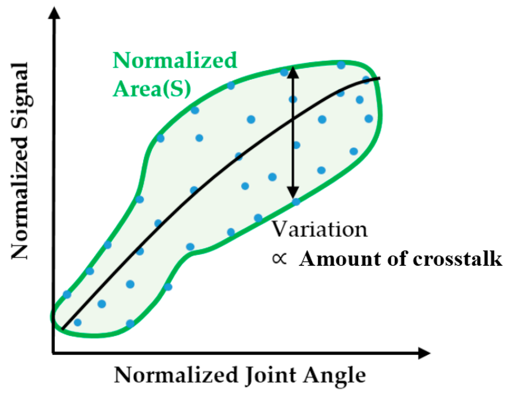 Deriving the magnitude of crosstalk of the CMC-joint angle sensor from a plot of the normalized sensor output with respect to normalized joint angle. The magnitude of the normalized area, S, represents the overall magnitude of crosstalk.