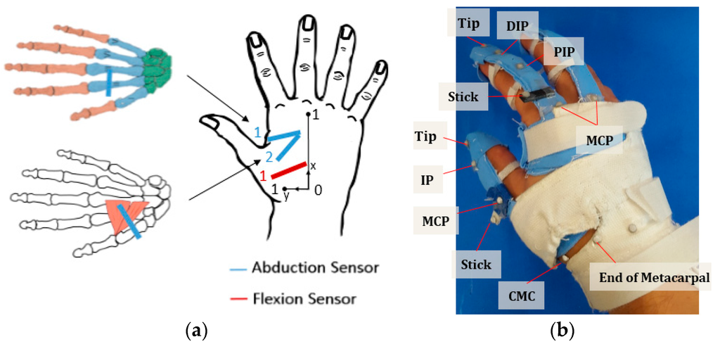 Optimal positioning of the CMC-joint angle sensors also improved the accuracy of joint angle estimation. By placing the bending sensors in the optimal locations and using the clinical definitions of the DOFs of the CMC-joint movement, the accuracy of the CMC-joint angle estimation was improved. After simple calibration, even without compensating for crosstalk, the CMC-joint angle measurement error was improved to 2.8° ± 1.9° for the flexion sensor and 1.9° ± 1.2° for the abduction sensor-lower than the error values reported in previous studies [15,16]. However, direct comparison with these previous studies may be difficult due to the difference in the kinematic definition of the CMC-joint angles.
