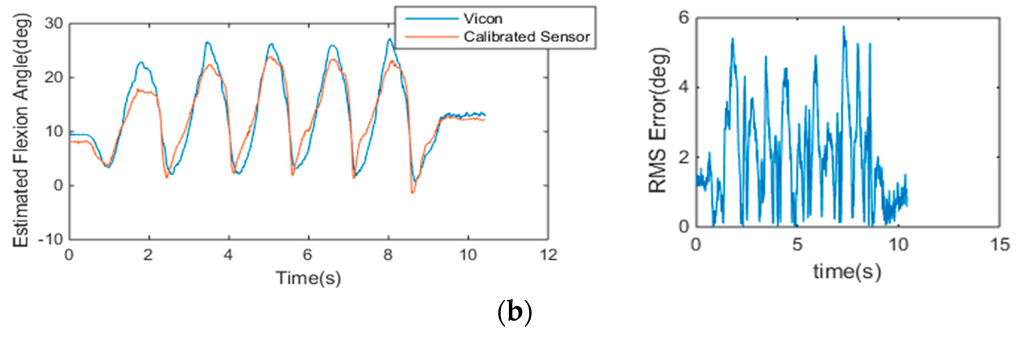 Representative results for response of the calibrated sensor with respect to the CMC-joint angles: (a) CMC-joint abduction angle estimated with Vicon and with the calibrated abduction sensor (left) and the RMSE of the calibrated abduction sensor with respect to the Vicon results (right); (b) CMC-joint flexion angle estimated with Vicon and with the calibrated abduction sensor (left) and the RMSE of the calibrated flexion sensor respect to the Vicon results (right).