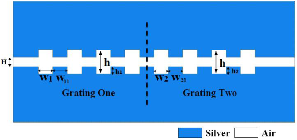 The designed sensor based on MIM structure is shown schematically in Figure 1, where the gap filled with air is inserted to separate silver. We regard the structure as two integrated grating with the same material. The main parameters of the structure are the depth, width of the grating, two widths of the waveguide and the distance between two segments, h1 (h2), w1 (w2), h, H, w11 (w21) denote them, respectively. Chen has already figured out that as effective n = (w1 + w11)/w1 rises, the dispersion curve approaches that of the structured metal wires [24]. In this paper, we assume w1 = w11, w2 = w21, and H stays at the same in all conditions that we will discuss. The light can be coupled into the Bragg grating sensor by nanofiber, and the output light can be detected by microscopy [25]. We use COMSOL (COMSOL Inc., Stockholm, Sweden) to realize our simulations. Input and output are set as port 1 and port 2, respectively, and transverse magnetic (TM) modes are incident from port 1. The calculated area is divided by Yee’s mesh with a size of 2 nm. The FEM with scattering boundary condition is employed to investigate the transmission characteristics of the structure.