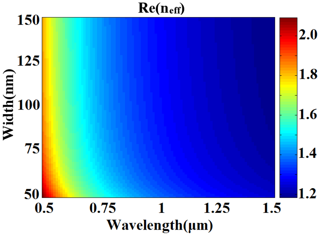 where εm and εi are the dielectric constants of the silver and air, respectively. k0 is the wave vector of light in vacuum. The neff = β/k0 can be calculated by Equation (1). The real part of neff as a function of ω and λ is shown in Figure 2. When ω is determined, Re (neff) will change little with the increase of the incident wavelength λ.