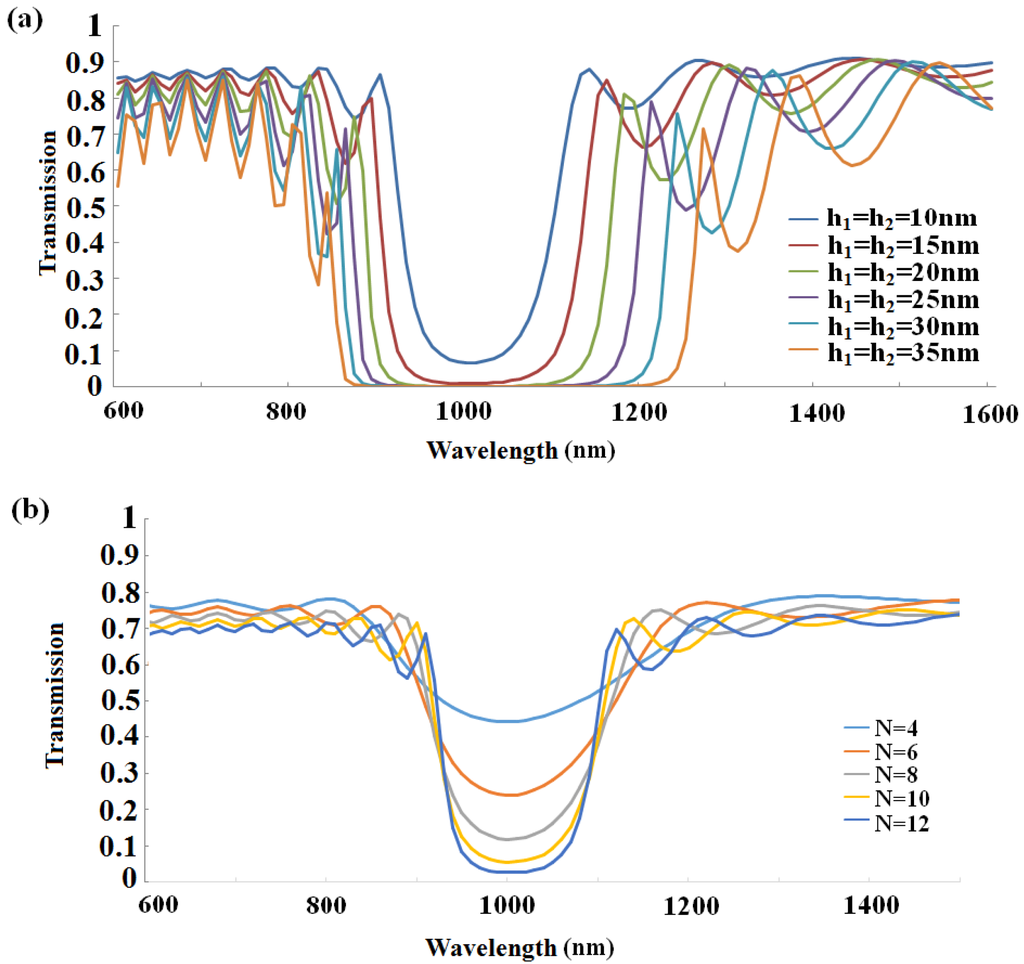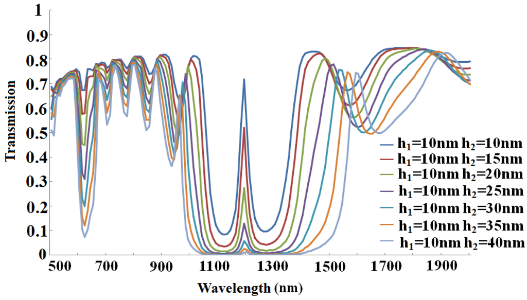 Before starting the discussion about width, we look into graded height of the Bragg grating first. Here, we only change the height of grating two (h2). In Figure 6, we can see that the transmission maximizes at the same Bragg wavelength, approximately around 1200 nm, but the peak value goes down sharply as grating gets deeper, and when h2 = 40 nm, three times deeper than h1, it almost disappears. Meanwhile, the Q factor drops quickly, from 30 to 20, which is partly caused by the great energy loss in the transmission process. Therefore, the values we choose that h1 and h2 are equal to 10 nm are reasonable choices for better understanding our structure.