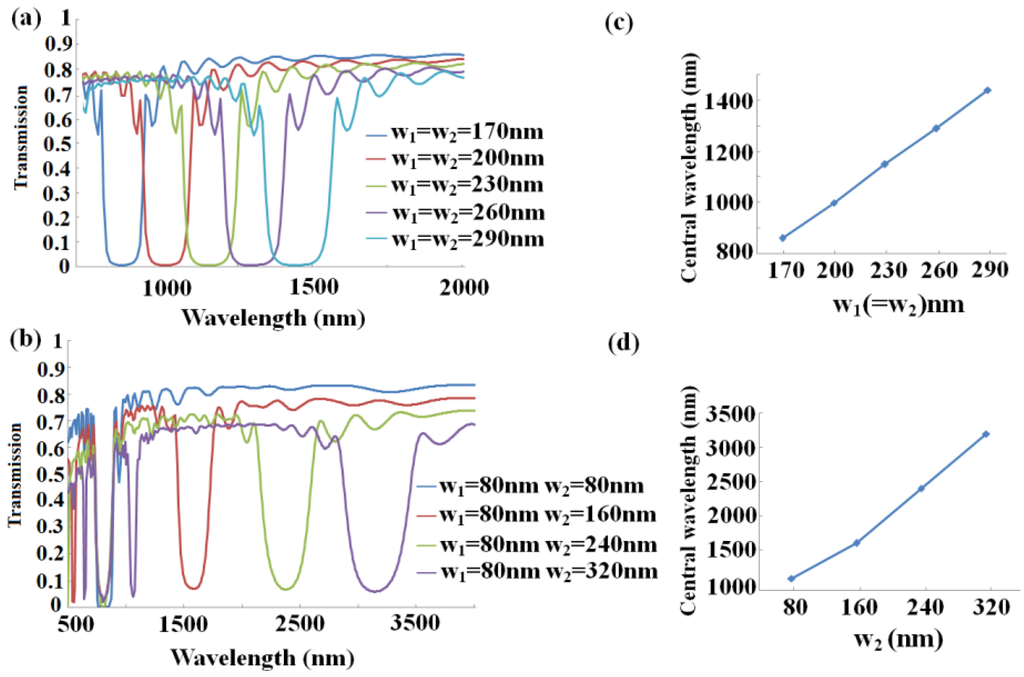 As we know, the width modulation can be achieved by altering structure parameters. Thus, we investigate parameter effects on the transmission property. From the Bragg condition, the central wavelength of the stop-band depends on the value of structure parameter w1 and w2 with the effective indices remaining unchanged. We choose n = 8 for both gratings, w1 equals to w2, changing from 170 nm to 290 nm, and increasing 30 nm at a time. As can be seen from Figure 4a, the Bragg wavelength increases with the expansion of the width, which is in accordance with Equation (3). The transmission spectra vs. wavelength with different width w2 have been depicted in Figure 4b, where w1 is fixed at 80 nm and other parameters stay the same. As the value of w2 increases from 80 nm to 320 nm, the first band-gaps of four spectra overlap at around 700 nm, but the central wavelength of the second one exhibits a red-shift and the band gap becomes wider, which also agrees well with Equation (3). Obviously, most linear responses in Figure 4c,d clearly depict the central wavelength as a function of the grating width in the two conditions mentioned above.