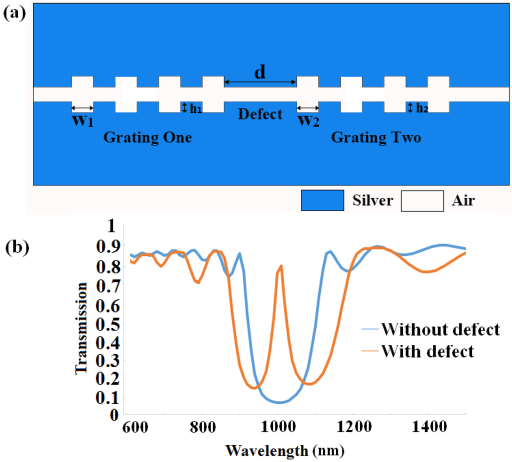(a) The structure of the MIM plasmonic Bragg grating without defect; (b) comparison of the Bragg grating and the Bragg grating with a defect d = 400 nm.