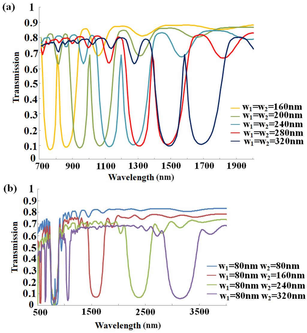 (a) The transmission spectra with grating width w1 and w2 increase together; (b) the transmission spectra with grating width w2 changing and w1 = 80 nm being fixed.
