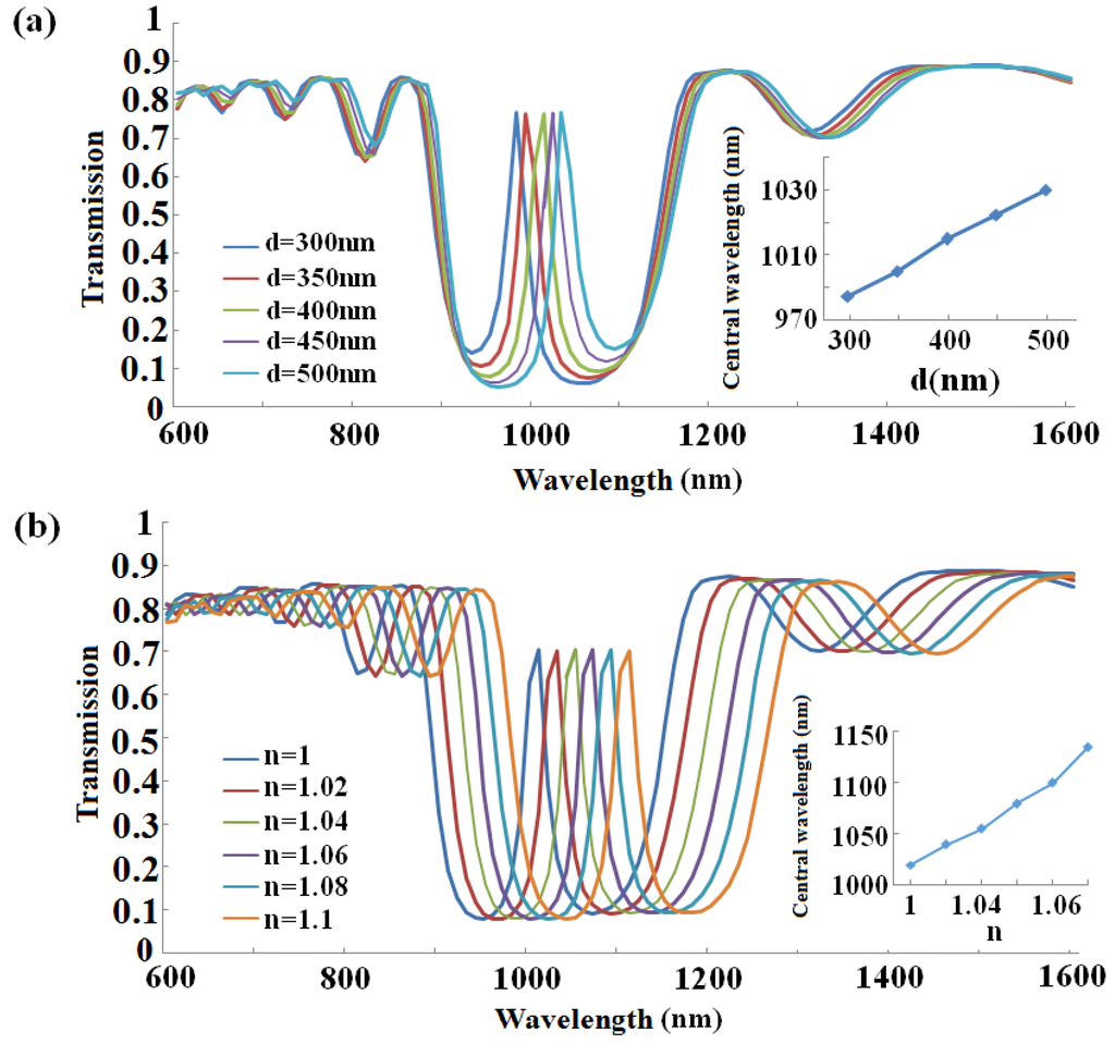Characterization of the MIM-based Bragg grating with a defect (a) transmission spectra as a function of wavelength with different defect width d; (b) transmission spectra as a function of wavelength with different effective index n.