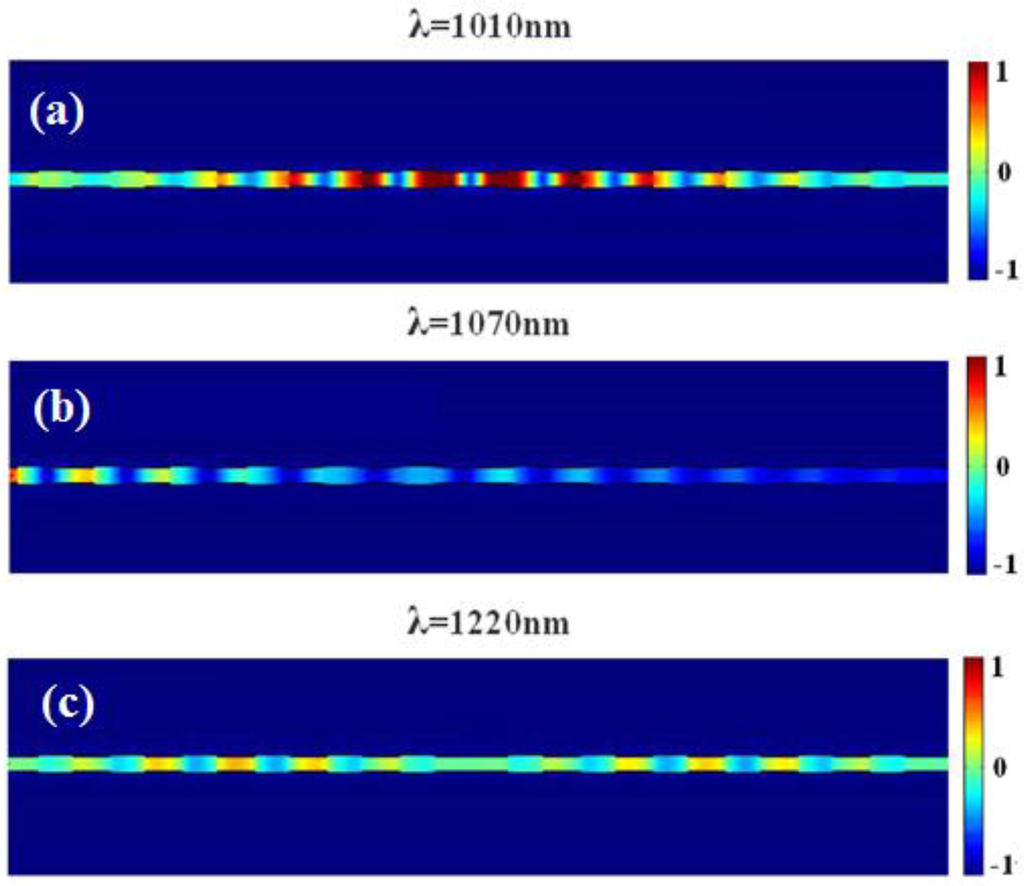The contour profiles of normalized electric field distributions under different wavelength with defect length d = 200 nm (a) λ = 1010 nm; (b) λ = 1070 nm; (c) λ = 1220 nm.