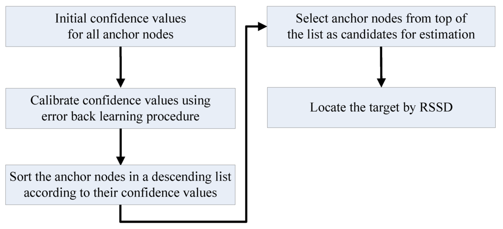 The contributions of this paper are as follows: (1) a confidence value is proposed for each anchor node to indicate its accuracy for RSSD localization. The mechanism is used to assist in the selection of anchor nodes for position estimation; (2) an error back propagation mechanism is introduced to determine and maintain the table of confidence values. Furthermore, an automatic calibration device is designed to help the learning procedure; (3) the acceleration of the target is sampled to estimate the position during fast movement, and an unscented Kalman filter (UKF) is introduced to reduce the influence of measurement noise; (4) a quadtree structure is introduced to describe the region correlation of the area, and the anchor nodes that are unnecessary are set to sleep to save energy. Thus, the lifetime of the entire localization system can be prolonged.