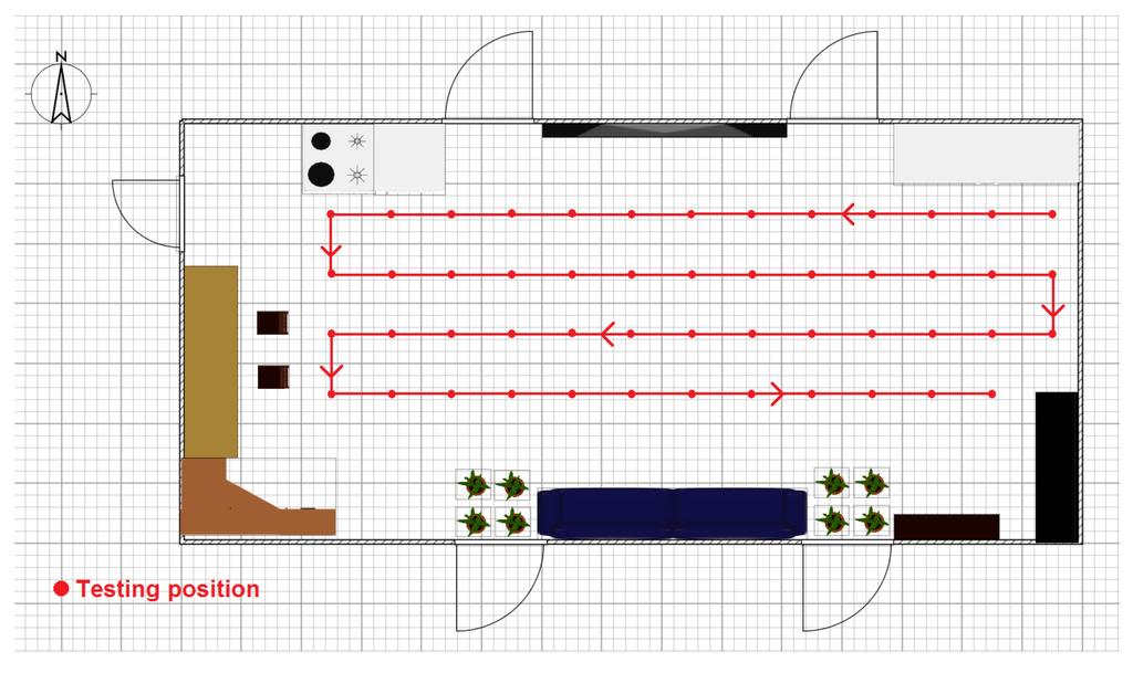 Because WSN localization systems are often deployed in environments without GPS satellite signals, the second and third testing scenarios are in a basement to simulate the circumstances. Figure 17a shows an illustration of testing scenario 2, which is a pump and electrical room in the basement of a building underground without GPS or mobile phone signals. The metal equipment in the basement produces disturbances in the RSSI signal, which can be used to test the robustness of the system. Figure 18 shows the map and nodes’ deployment of scenario 2, and the interval between two neighboring anchor nodes is set to 4 m. The 100 testing positions are arranged on a set of broken lines, and the running parameters of the system are set to be the same as in scenario 1. The UKF is employed to increase the accuracy for locating the moving target, and the testing results are shown in Figure 16b. In the still testing mode, the RSSD-BP had an average RMSE of 0.99 m, which is 72.3% of the 1.37 m of RSSD-RS. Thus, the BP learning procedure increases the accuracy by selecting suitable anchor nodes for estimation. Moreover, the RSSD-BP+ME also acquires the highest accuracy in the moving test.