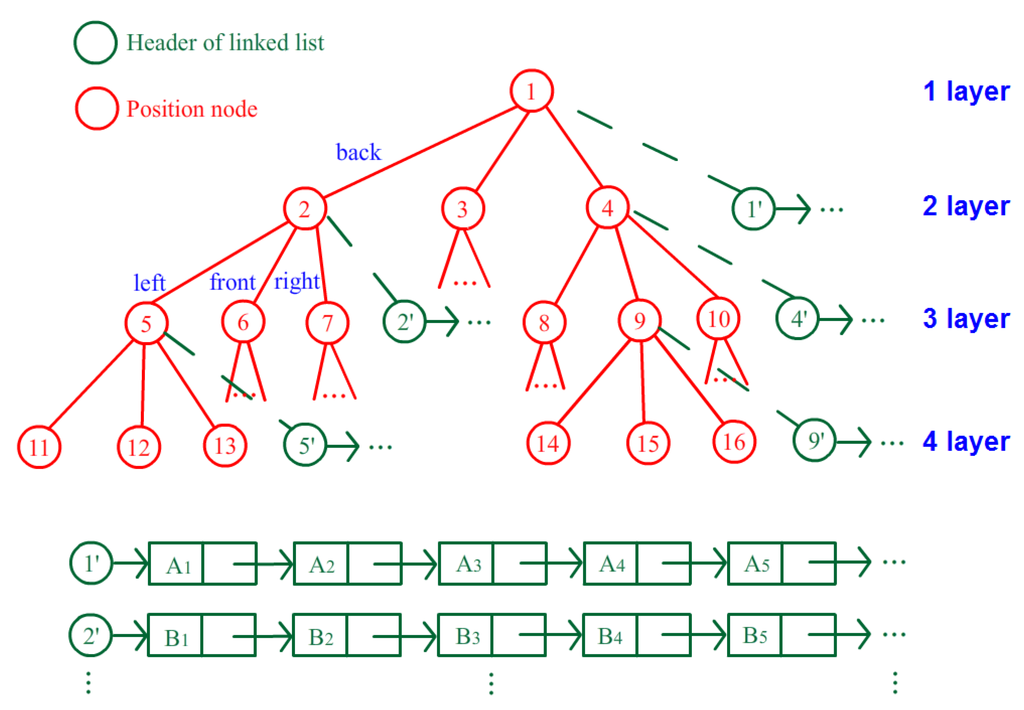 Every node of the quadtree has its fourth child marked by a green circle in Figure 10, which is a header of the linked list of anchor node candidates for this partition. The linked list is organized as a queue according to the suitable degree of these anchor nodes for localization in the partition. Thus, the selection can be made using the top elements of the list. Moreover, the awakened anchor nodes can be selected by the structure of the quadtree. The current element that represents the target standing partition is first found out on the quadtree. Then, the anchor nodes associating with elements several layers up or down the current element on the quadtree are activated for preparation. Therefore, only anchor nodes associated with the surrounding partitions of the target use energy to wait for the possible entrance of the target, and the other nodes can fall asleep to save energy. A level constraint parameter Lr is set to indicate the range of activated elements on the tree. If Lr = 2, the anchor nodes associated with the elements two layers up and down from the current element (including the current layer, five layers in total) need to be activated. A large Lr will improve the response speed and continuity of localization but will have a high energy cost.