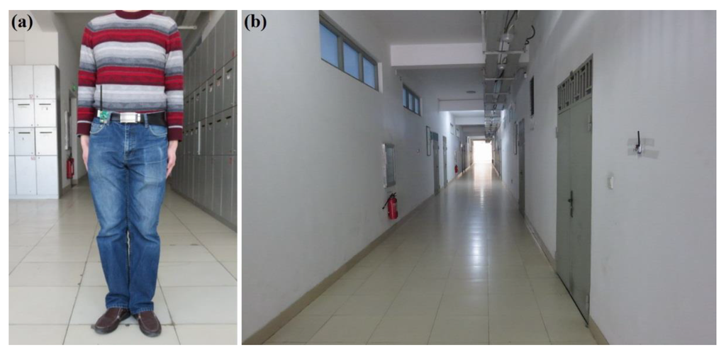 The experiments were performed in three typical scenarios to test the proposed methods. The first scenario was a narrow corridor in a teaching building, as shown in Figure 13b, for simulating the environment of a narrow pit. Figure 14 shows the map of this scene, and 29 anchor nodes were deployed with an interval of 7.5 m to localize the blind target by RSSD. The blind target can be carried in two ways: by a man, as shown in Figure 13a, or equipped on a robot, as shown in Figure 5. The accuracy of RSS information provided by an anchor node is mainly influenced by its surrounding environment, such as, metal, special building structure or other radio emitter. Thus, the calibration procedure in the paper is aim to figure out the ranking of anchor nodes with consideration of their accuracy for localization. During the whole calibration procedure, the same robot with the target device (CC2431) several centimeters up ground is used and it is found that the same devices’ height has the same influence on all the anchor nodes. Therefore, we get the result that devices’ height could not affect the ranking of anchor nodes in the procedure. For testing, the target node may be carried by a man and therefore the devices’ height may be different from the height of calibration robot after calibration. The positions of all the anchor nodes are kept the same from calibration to testing procedure and their surrounding environment is not changed, so the different heights of devices carried by tester would just have influences on the average position RMSE (root mean squared error) of localization system. However, it is not caused by calibration procedure, as the ranking of anchor nodes is not changed. As shown in Figure 14, 100 testing positions were set along the moving trace marked by the red dotted line to test the localization ability of the system in the entire area. Under scenario 1, the moving trace was set in the middle of the corridor, and the testing positions were selected by random spacing distances. Owing to the fluctuation of the RSSI signal during target movement, there are two different testing modes in our experiments: (1) still mode: localization is operated 10 s after the blind target stops at the testing position; (2) moving mode: the target node is equipped on a robot and moved along the moving trace, localization is performed during the entire time and the estimated values at the testing positions are determined to evaluate the performance of the system.