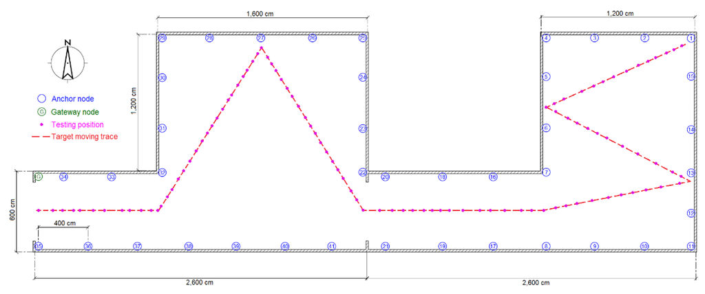 Indoor localization is an important field of research with numerous applications in modern daily life [1,2,3], such as elderly care [4], miner security [5] and robot guidance [6]. The Global Positioning System (GPS) [7] is a satellite navigation system that provides successful outdoor geospatial positioning service globally. However, it is not feasible for deployment in indoor environments owing to its requirement for a direct view from several satellites [8]. Consequently, the development of non-GPS-based solutions for indoor applications based on existing hardware has gained significant attention in recent years [9,10,11]. The wireless sensor network (WSN) is one suitable platform for this application [12]. The task of the WSN for localization is to determine the distance between a moving target and anchor nodes with known positions on a map based on the signal strength or transmission time [13].