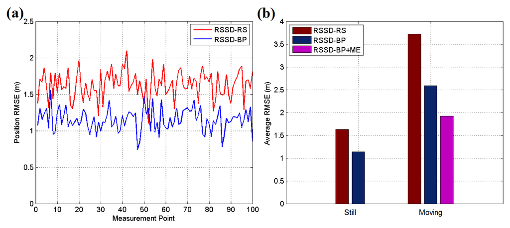 Figure 15 and Figure 16a present the experimental results for each testing position in scenario 1, and the localization accuracy is measured by the average position root mean squared error (RMSE). According to the datasheet of CC2431, the chip contains a location engine with readout resolution of 0.25 m. However, in actual application, the localization system is very hard to achieve this ideal accuracy due to the obstacles or noise in environment. The RSSD-RS method, which chooses the anchor nodes for its estimation by random selection, achieves an average position RMSE of 1.11 m in the still testing mode, and the RSSD-BP method, which chooses anchor nodes by proposed confidence values and the BP learning procedure, acquires an average RMSE of 0.83 m in the still mode. In the moving testing mode, the RSSD-BP has an average RMSE of 1.89 m, which is 75.6% of that of RSSD-RS, as shown in Figure 16a. The movement behavior of an object may lead to a large increment in the localization error because of the instability of the RSSI signal during activity. However, movement estimation based on the accelerometer and magnetometer introduced in Section 4.1 can help to achieve higher accuracy in the moving environment. Thus, the RSSD-BP+ME group, which uses the RSSD-BP with movement estimation, obtains the lowest average RMSE of 1.42 m in Figure 16a owing to its employment of movement information instead of RSSI data for estimation during activity. Furthermore, Figure 15b shows that the RSSD-BP+ME method can reduce the fluctuations in the RMSE curve for more homogeneous results for different testing positions.