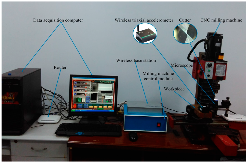 The experimental setup for TCM and RUL prognostic is shown in Figure 3. A mini CNC milling machine (Xendoll Tech C000017) with spindle speed up to 2500 rpm/min is used in the experiment. A tempered steel (HRC52) is machined as a workpiece using micro grain carbide two-flute end milling cutter (Type: Seco S550, 6 mm diameter) coated with multilayer coatings of Titanium Aluminum Nitride (TiAlN). A wireless triaxial accelerometer (Type: M69) manufactured by Mukun Tech is mounted on the workpiece to measure the vibrations in three directions (x, y and z) during cutting operation. The outputs of the wireless sensor are processed by the corresponding wireless base station (Type: M90), and the vibration signals are transmitted to the upper computer through the Local Area Network (LAN).