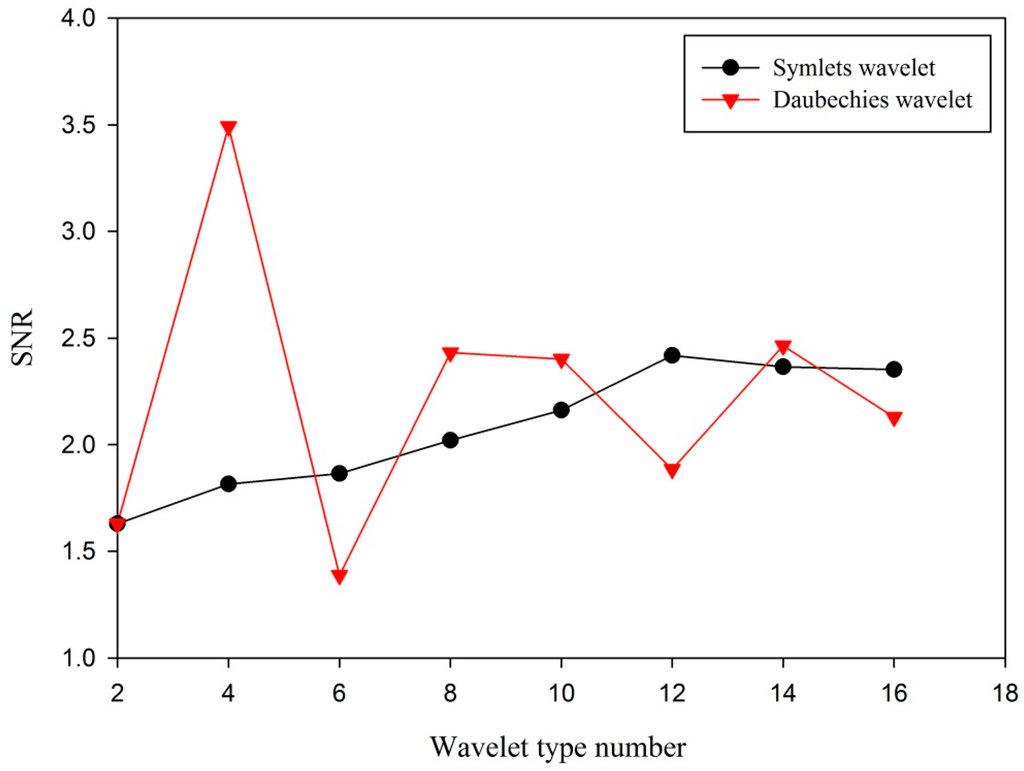 Here, the acquired three channels of vibration signals are de-noised based on WT, and the SNR is used as a criterion to measure the performance of signal de-noising. For example, the vibration signal is decomposed at level 5 by different symlets- and daubechies-family wavelets, and the detail coefficients are rescaled using heuristic threshold selection, level-dependent estimation of level noise, and soft thresholding. The de-noised signal is reconstructed by the rescaled wavelet coefficients. The optimal wavelet de-noising parameters are selected based on the SNR criterion. The comparison of vibration signal de-noising performance based on symlets- and daubechies-family wavelets is illustrated in Figure 5.