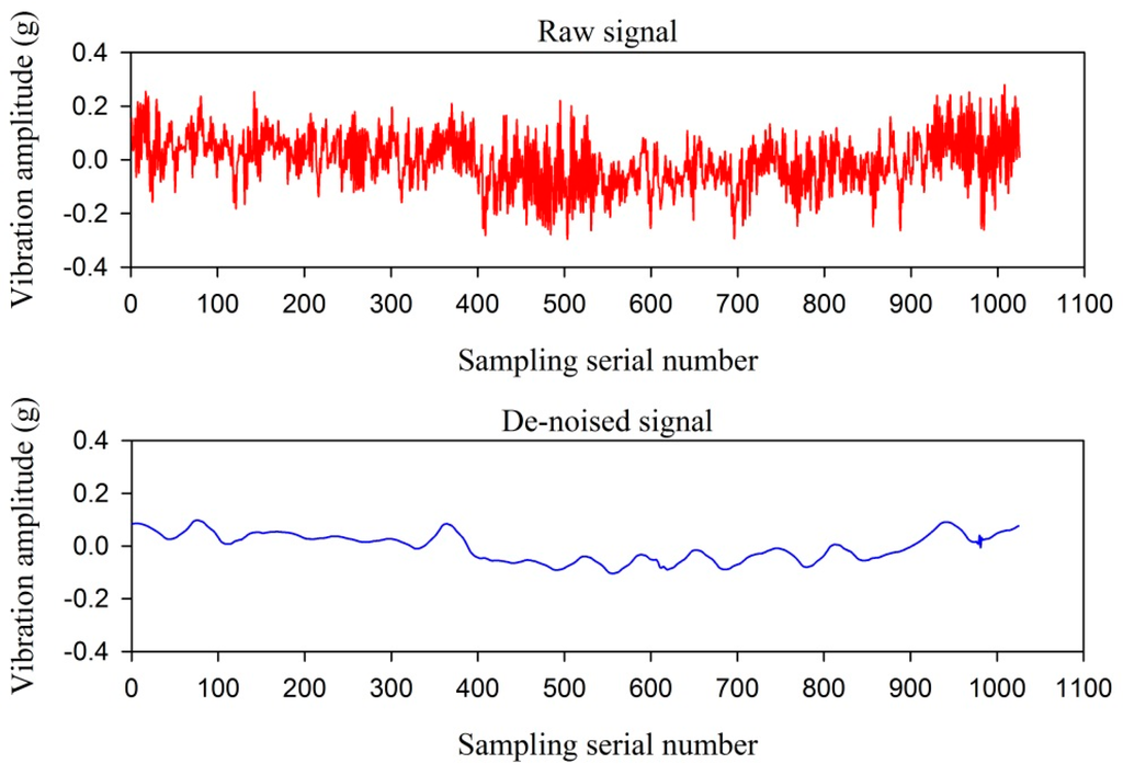As can be seen from Figure 5, when the vibration signal is decomposed by db4 wavelet, the de-noising performance is optimal, and the SNR is 3.49. The wavelet is selected to decompose and de-noise the vibration signal. The raw vibration signal and the de-noised vibration signal are illustrated in Figure 6.