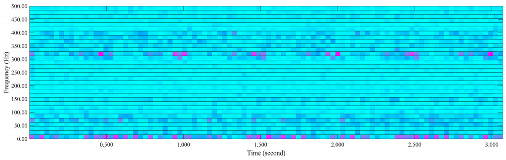 Frequency domain features reflect the signal’s power distribution over a range of frequencies. Fast Fourier Transform (FFT) is used to extract the frequency domain features, while the spectrums of frequency components are the frequency domain representation of the signal. Power spectrum is measured in the 0 to half of sampling rate frequency band. Such an example for vibration signal is illustrated in Figure 7. There are a lot of extracted features, such as the maximum, sum, mean, variance, skewness, kurtosis of band power spectrum and relative spectral peak per band, as summarized in Table 2. Frequency domain features only reflect the signal changes over frequency and do not provide any type of time information, and thus it is needed to further extract the time–frequency domain features.