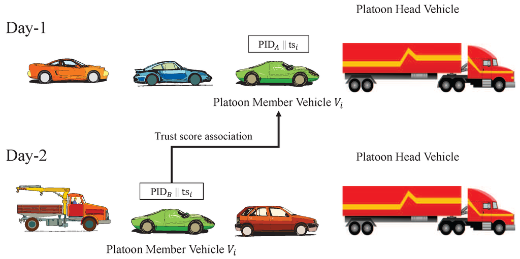 Furthermore, this new data aggregation way may also bring in privacy concerns into the networks. For example, the sensed data could reveal the capacity of a vehicle’s sensor and hence reveal the personal information of the vehicle. Another factor that has always been a concern is the location privacy, since the locations of the vehicles are closely related to the drivers of those vehicles [9]. To achieve location privacy, one approach is to use unlinkable pseudonyms that are periodically changed when broadcasting messages [10,11,12]. However, pseudonyms do not always ensure privacy, as an example shown in Figure 1, a platoon head vehicle is asking its platoon member vehicle for participating in the sensing task. When responds by sending its own reputation score at Day-1 and Day-2, respectively, the platoon head vehicle can still associate in different days by associating its trust scores even when its pseudonym has been changed. The unchanged trust score of a vehicle reveals its location privacy and the platoon head vehicle can even derive the driving pattern of the platoon member vehicle. Therefore, it is compelling for us to build a trust system through which vehicles take its advantages without sacrificing their privacies, and a data aggregation mechanism to ensure data privacy.