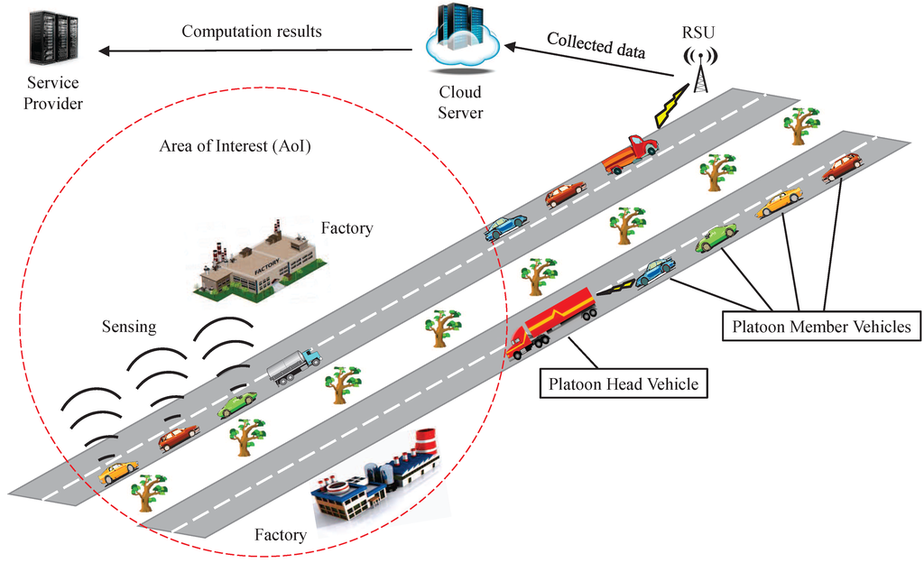 In our model, the service provider (SP) wants to inspect an area of interest (AoI) located near a highway where many platoons pass by. As illustrated in Figure 2, our system model consists of three roles: the service provider (SP), a cloud server (CS), the immobile roadside units (RSUs) along the highway and mobile vehicles traveling on the highway, which are equipped with onboard units (OBUs) and powerful sensors.