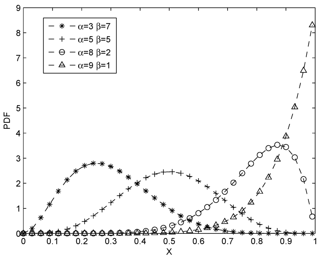 Figure 3 shows the PDF of beta distribution with different parameters α and β. It expresses the uncertain probability that a process will produce positive outcomes in future. Take the example, when , , according to expectation equation, the probability expectation value of this type of beta distribution is , which can be interpreted as the relative frequency of positive outcome that is somewhat uncertain and that the most likely value is 0.8.