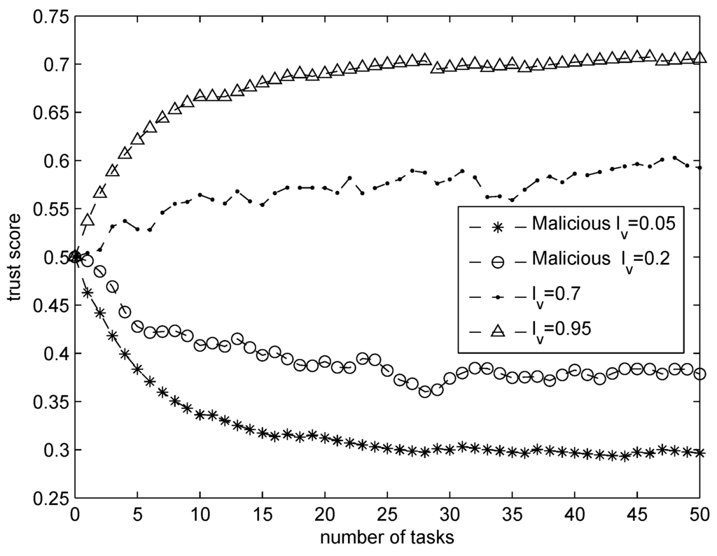 In this experiment, we target comparing the trust scores between malicious and honest sensing PM vehicles with different sensing accuracy levels (SALs). For a better comparison, we choose two honest PM vehicles with FAL of and , respectively. In addition, other malicious PM vehicles who provide corrupt sensed data are also put into the system. After “50” number of tasks, we plot their trust scores in Figure 4.