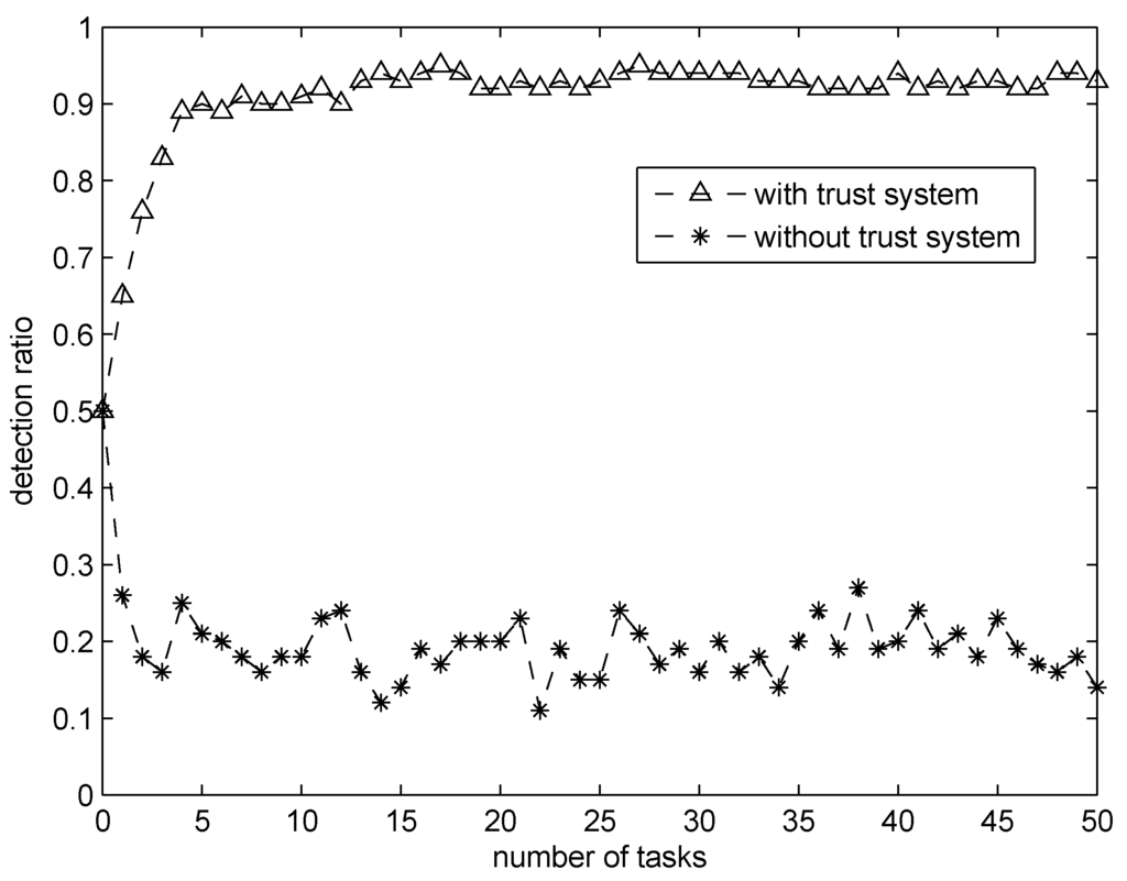Figure 5 depicts the detection ratio between our proposed trust-based sensing system with a sensing system without trust. From the figure, we can see that our proposed system’s detection ratio increases quickly with the increase of task numbers, and, after around 5 tasks, it will be convergent to . On the contrary, for a sensing system without a trust system, the selection of sensing PM vehicle is random and the detection ratio remains as low as . Therefore, the effectiveness of our proposed scheme has been demonstrated.