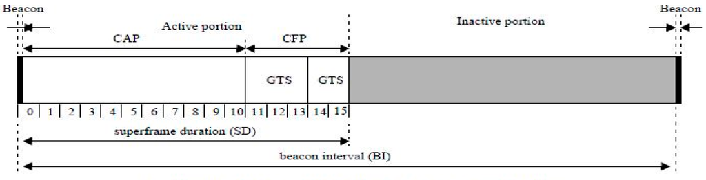 1]. The superframe is made up of an active and an inactive period. The active period contains 16 time slots, each consisting of 20 symbol periods, which are individually called unit backoff periods. In 2.4-GHz IEEE 802.15.4, each symbol contains 4 bits of data and the symbol rate is 62.5 (ksymbols/s), so the duration of the unit backoff period is 320 microseconds. The active period is divided into a contention access period (CAP) and a contention free period (CFP). In the CAP, data transmission is performed by using CSMA/CA and data transmission using allocated guaranteed time slot (GTS) is performed in the CFP.