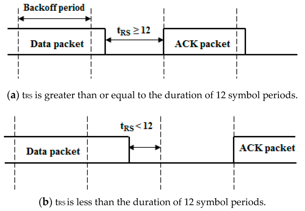 RS[sec] after the reception of the last symbol of the data packet is greater than or equal to the duration of 12 symbol periods, the ACK frame is transmitted at the next backoff period. If the remaining symbol is less than the duration of 12 symbol periods, the ACK frame is transmitted after a one backoff period delay.