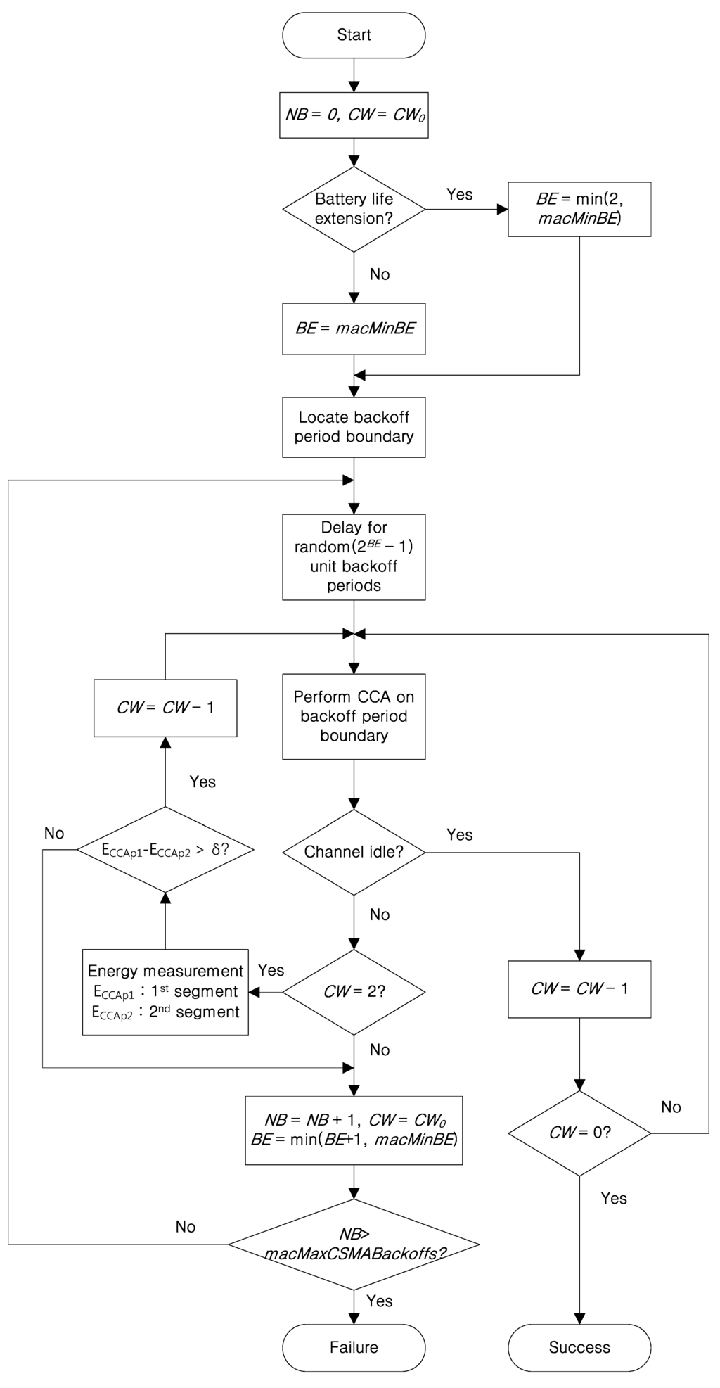 Figure 3 shows the flow chart of the segmentized CCA. If a device has a data packet to send, it waits for a random backoff period chosen between 0 and 2