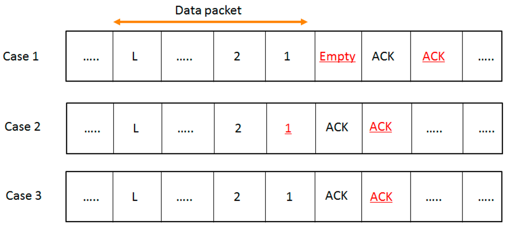 Case 1: An empty backoff period exists between the data and ACK packets. In this case, the proposed algorithm senses the channel as idle at the end of the ACK transmission. Therefore,