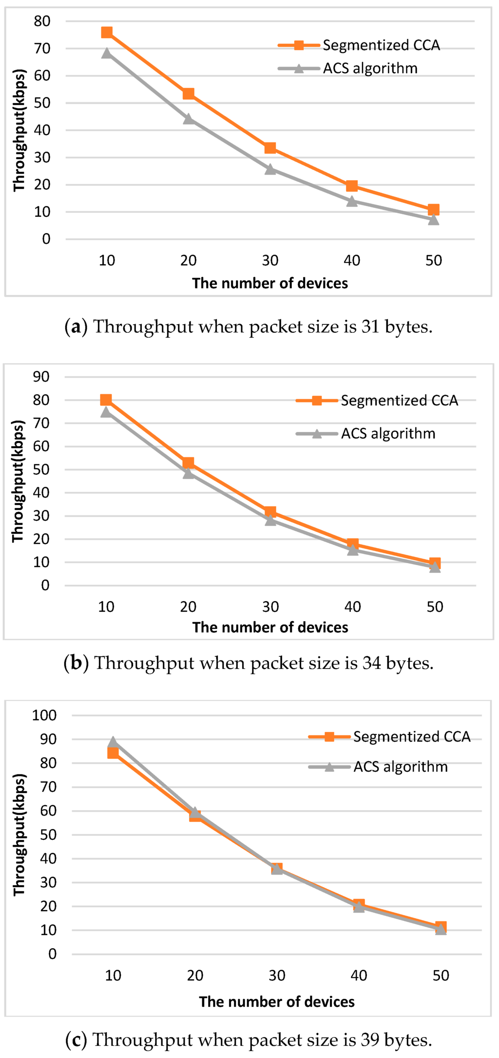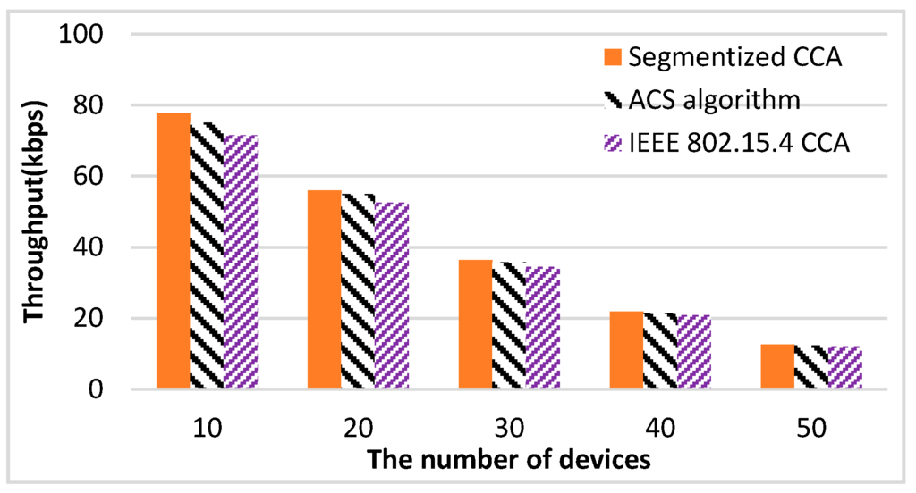 versus the number of devices. The proposed method shows the best throughput performance regardless of the number of devices. Since the ACS algorithm focuses on the failure of the second CCA caused by an ACK packet, the ACS algorithm does not work if there is no empty backoff period between a data packet and the ACK packet. On the other hand, the segmentized CCA works all the time since the proposed method focuses on detecting the end of the packet transmission at the first CCA.