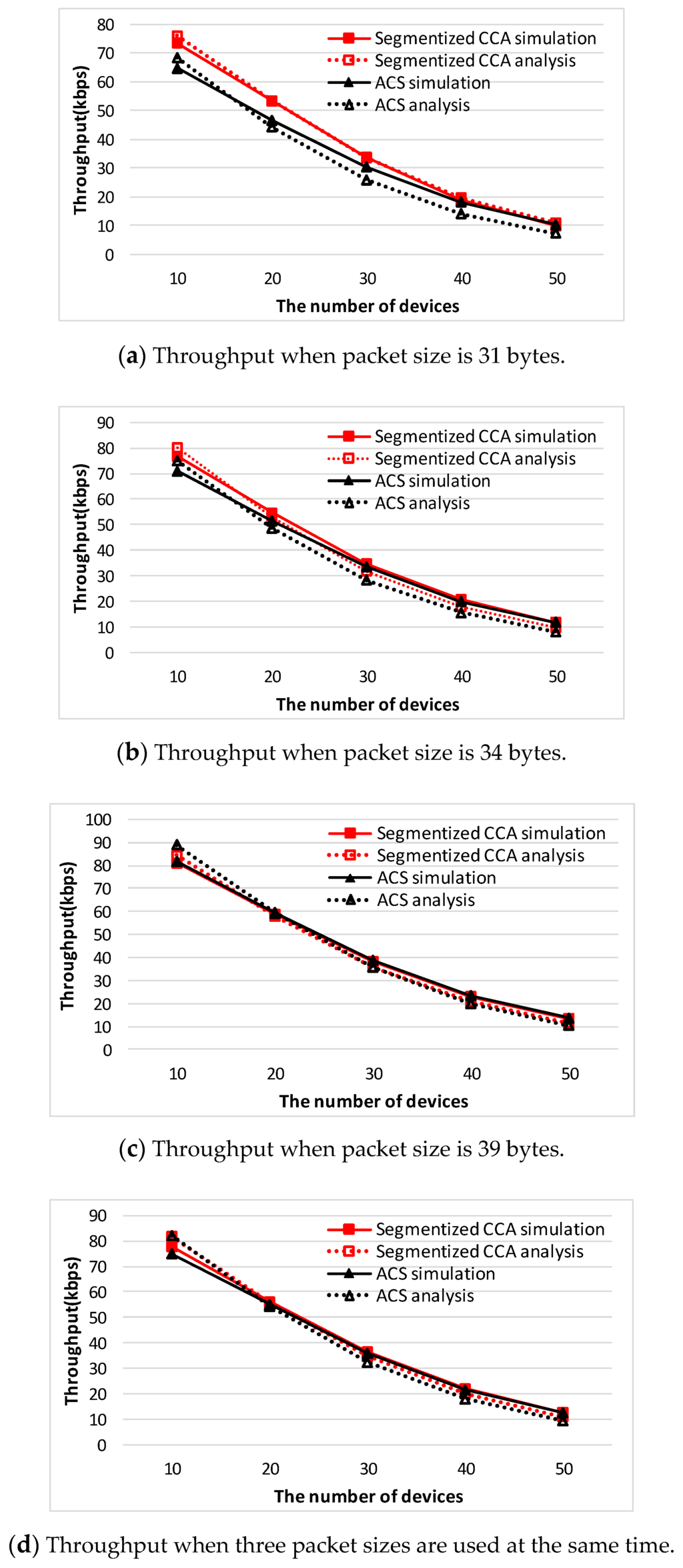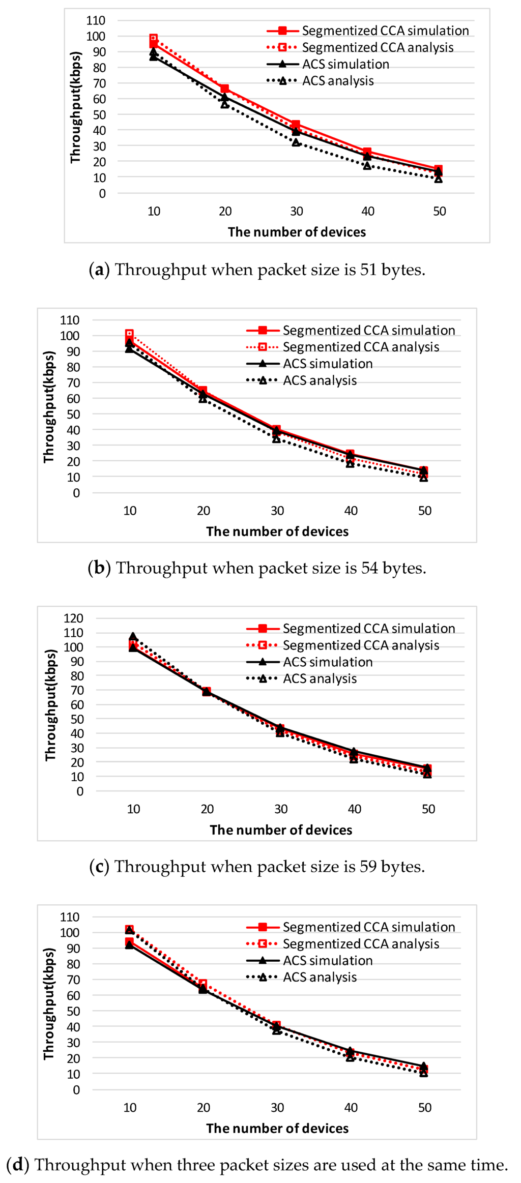 Figure 9 shows a comparison of analysis of the throughput values between the segmentized CCA and the ACS algorithms when three packet sizes are used at the same time.