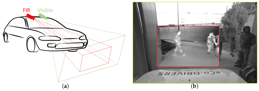Camera setup for the CVC-14 dataset and registered sample frames showing the different field of views. (a) Fields of view of the visible and far infrared cameras and (b) example images.
