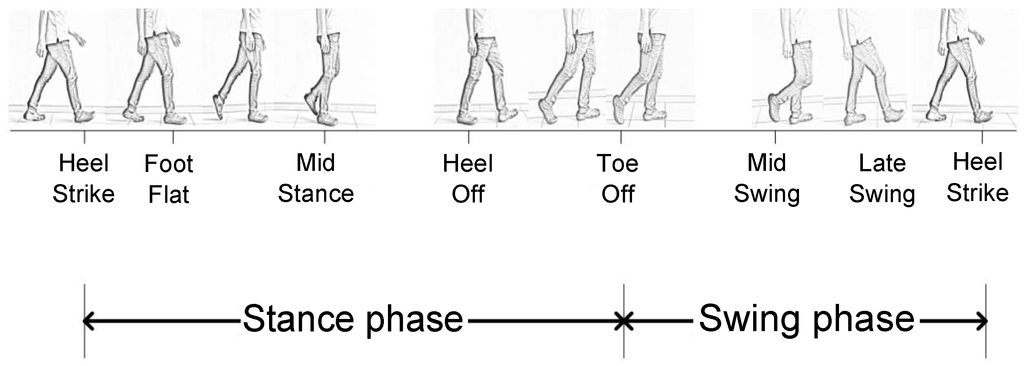 Typically, a gait cycle can be divided into seven phases [26,27,28], i.e., heel strike, foot flat, mid stance, heel off, toe off, mid swing and late swing. The phases of a gait cycle are depicted in Figure 1. The heel strike indicates the period when the foot begins to contact the ground. The heel strike is the first phase of the gait cycle. The foot flat is the period where the body absorbs the impact of the foot by rolling in pronation. The mid stance phase begins when the other foot is lifted and continues until the body weight is pressed onto the forefoot. The heel off is the period where the heel begins to leave the ground. The toe off phase refers to the phase when the toe leaves the ground. In the toe off phase, the hip becomes less extended. In the mid swing, the adductors are contracted and the ankle is dorsiflexed by contraction of the tibialis anterior muscle. The late swing phase declares a locked extension of the knee and a neutral position of the ankle. A gait cycle ends at a new heel strike phase.