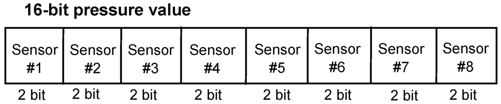 The inertial triaxial accelerometer sensor is placed in the center of the insole. The pressure sensors are placed at the rear of the shoe. Each pressure sensor contains a two-bit value representing the pressing level on the sensor. To effectively detect the gait phases of walkers, we fuse the data from these eight pressure sensors into a pressure value. The incorporate pressure value on the shoe is determined by a 16-bit value created from these eight two-bit values of the sensors, where the two bits of the first sensor are the most significant bits and the two bits of the eighth sensor are the least significant bits, as shown in Figure 3. This fusing method is designed to emphasize the importance of pressure on the first metatarsal area because this area is larger pressed compared with the fifth metatarsal area in straight walking.