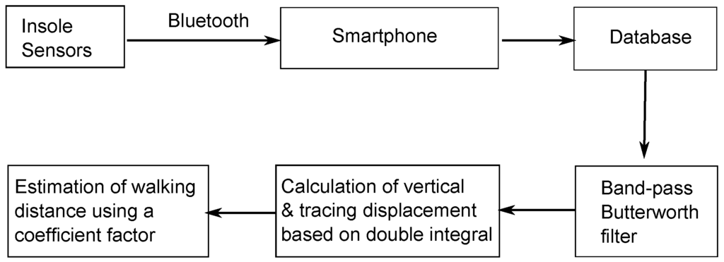 Using this insole sensor and a smartphone, we created our portable and concise system for estimating walking distance. We attached the sensor module, which includes sensors and batteries, into an insole and then placed it inside a shoe. The insole used in the system is the off-the-shelf insole, whereas, the experimental shoe is user’s sneaker. This design is to make users feel comfortable during their experiments, and thus ensure that their gaits are not affected. Indeed, we did not receive any complaints from experimental subjects about the discomfort of the insole during experimentation. Thus, we can provisionally conclude that the insole sensor module is unlikely to affect users’ gaits. The insole sensor is connected to the smartphone through Bluetooth to continuously transfer collected data. Figure 4 shows the flow of data in the estimation system. We use the sensor module in the insole of the shoe for the right foot and require walkers to wear this shoe to collect data during the walking period. The collected data are sent to a smartphone in the pocket of the walkers for storage and processing through the Bluetooth connection. We remove noise in the data received from the foot-worn sensors using a band-pass Butterworth filter with = 5 Hz, = 10 Hz. Finally, we apply our calculation method on these data to estimate the walking distance.