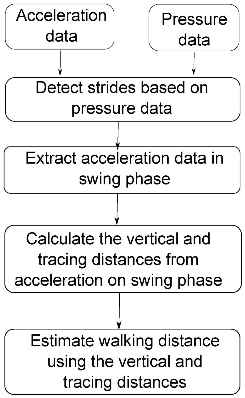 Based on this filtering, we can determine the period of swing in the walking motion. Moreover, with this pressure-based filter, we can easily calculate the exact number of strides in the walking distance. After extracting acceleration in swing phases, we apply double integral-based calculation to estimate stride lengths. Therefore, the walking distance can be measured.
