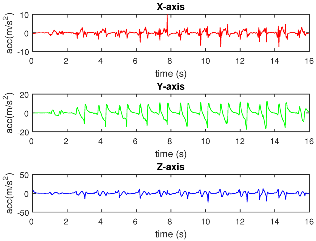 where and are gravity, raw acceleration and linear acceleration on X-,Y- and Z-axes, respectively. Moreover, we select for the low-pass filter.