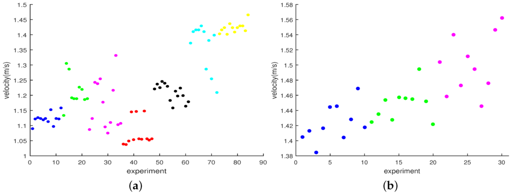 The subjects were required to walk normally in the straight distances with the insole sensor module installed in their right shoes and an Android smartphone to collect the acceleration and pressure information from the insole sensors. The smartphone connected with the insole sensor using Bluetooth and seamlessly received the data from the insole sensor module. We collected 84 samples of data of walking on the 16 m distance from the seven subjects to create the short distance walking database. Similarly, the long distance database was created based on 30 walking samples of three subjects on the 89 m distance. This group of three subjects is a part of the group of seven subjects who conducted experiments of short distance walking. The specific participation of each subject in experiments is shown in the last two columns of Table 2. The walking speed measured from all subjects varied in the range of 1 m/s to 1.6 m/s, specifically, m/s. Figure 9 shows the distribution of subjects’ average speeds in the experiments of walking on 16 m and 89 m distances. Different subjects are represented by different colors in experiments. The same color in the two subfigures illustrates the same subject in two databases.