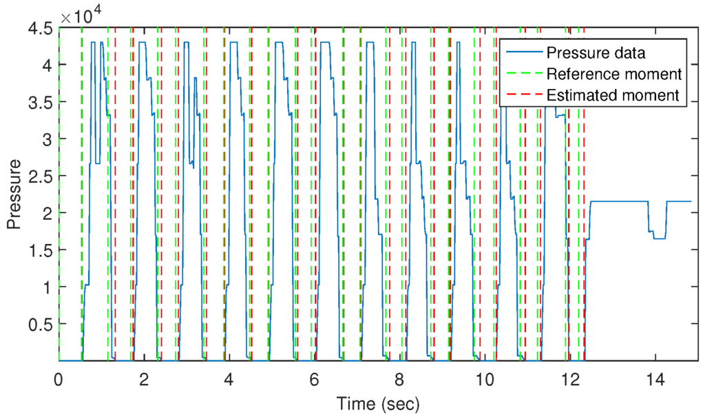 Using the pressure data to analyze the gait cycle, we can accurately estimate swing phases’ moment, and hence, an extremely precise result for stride counting can be calculated. To evaluate, we used a camera to record all subject movement during the walking periods. Specifically, we handle the camera and follow walkers to record their walking data. Using the recorded video, we manually marked the starting and stopping moments of swing phases to identify the reference information of swing moment. Compared with the estimated moment received from the swing phase determination, we obtained the maximum difference of 0.08 s and 0.06 s for the starting and stopping points, respectively. Figure 10 shows the difference between the estimated and reference moments of swing phases in a walking sample on the 16 m distance. Based on the swing phase determination, we counted the number of strides and compared this with the result received from the pressure analysis-based method to validate its accuracy.